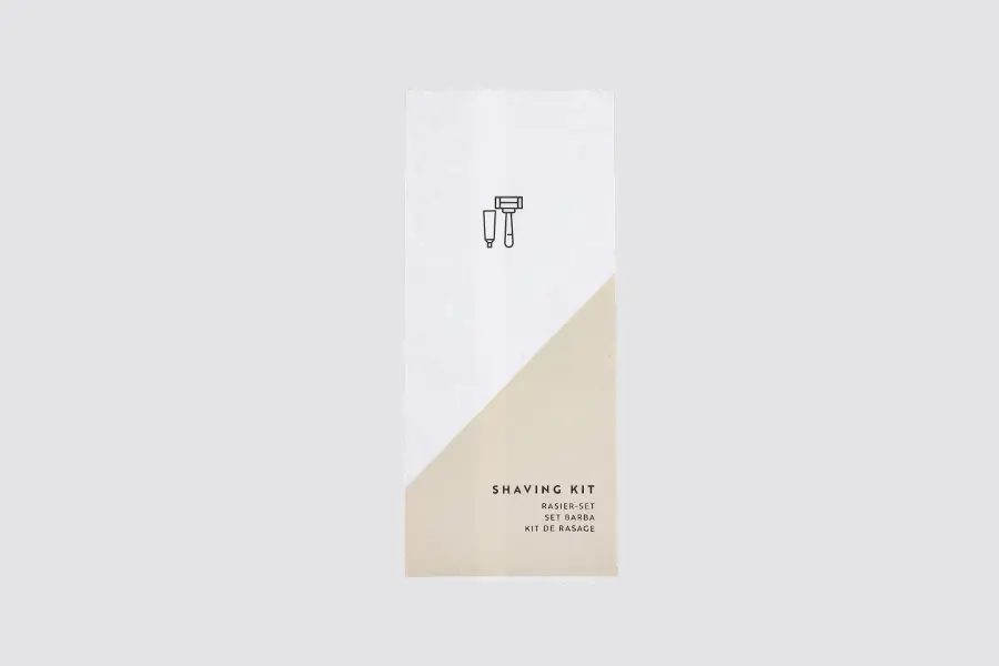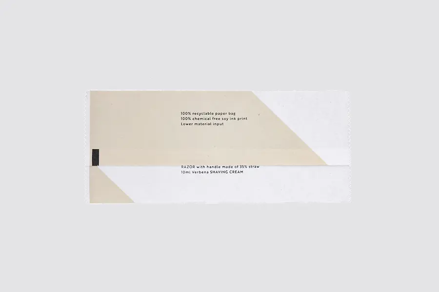 Rasierset in Papiersachet: 1 Doppelklingenrasierer, Griff aus 35% Stroh, 1 Rasiercreme Verbena 10ml. Papiersachet bedruckt mit Sojatinte. Der Druck aus Sojatinte ist 100% natürlich und chemiefrei. 50 Stück/Innenverpackung