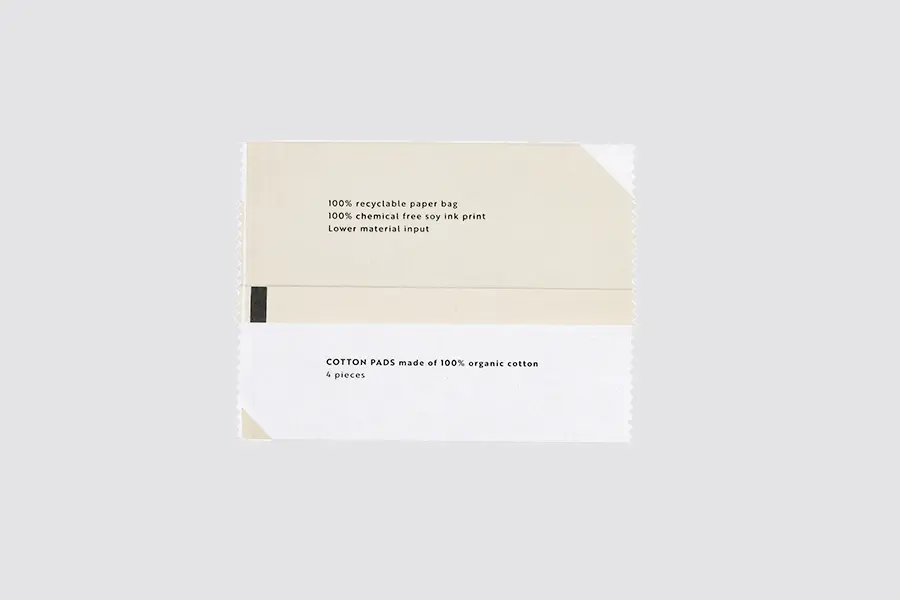 4 cotton pads made of 100% organic cotton in paper sachet. Paper sachet printed with soy ink. The soy print is 100% natural and chemical-free. 300 pcs./inner package