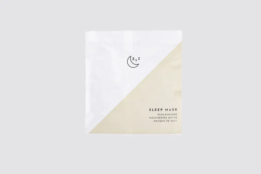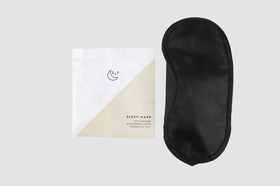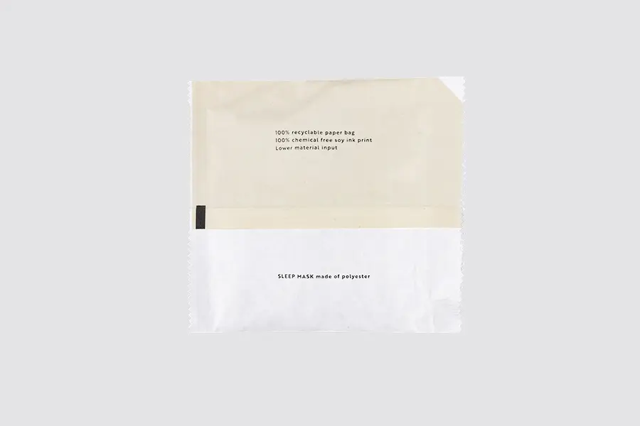 Sleep mask, black, polyester in paper sachet. Paper sachet printed with soy ink. The soy print is 100% natural and chemical-free. 50 pcs./inner package