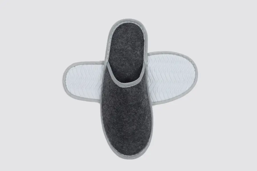 The Chamonix hotel slippers are the ideal choice for hotels and guest houses that want to offer their guests comfort and quality. The closed design ensures a pleasantly warm feeling and provides additional hygiene in guest rooms or during events. Made from robust poly-felt, these slippers stand out for their durability and high wearing comfort. The structured EVA sole offers light cushioning and keeps feet protected even on cool stone floors. With their neutral grey colour, the slippers blend harmoniously into any room concept.
