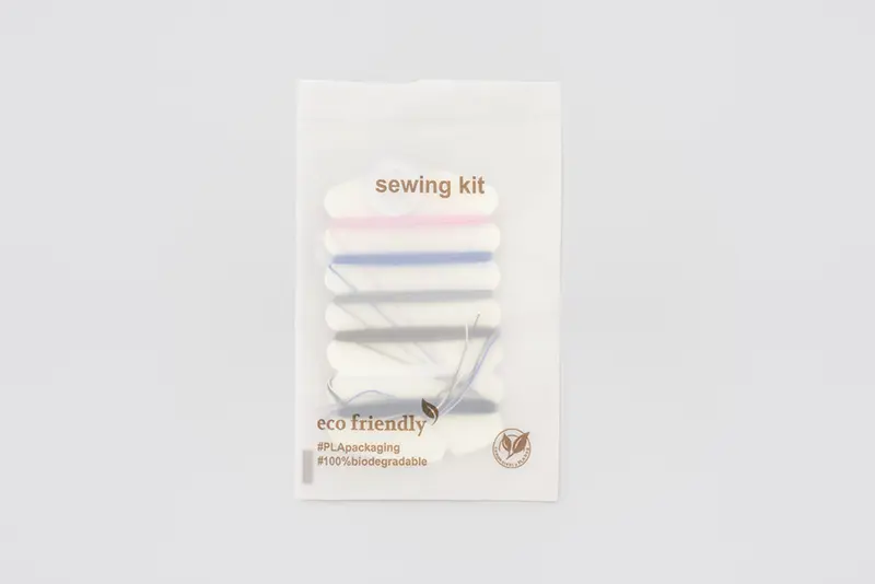 Sewing kit, white, 6 threads, 2 buttons, 1 safety pin, 1 needle, single packed in PLA bag with imprint "eco friendly", 500 pcs./inner package