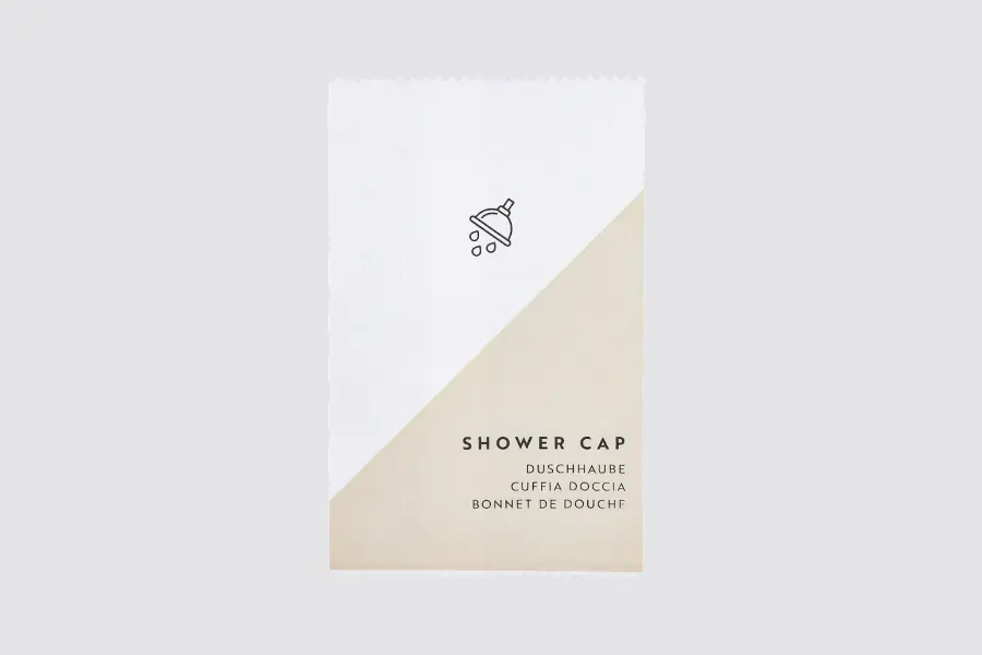 PLA Shower cap in paper sachet. Paper sachet printed with soy ink. The soy print is 100% natural and chemical-free. 100 pcs./inner package