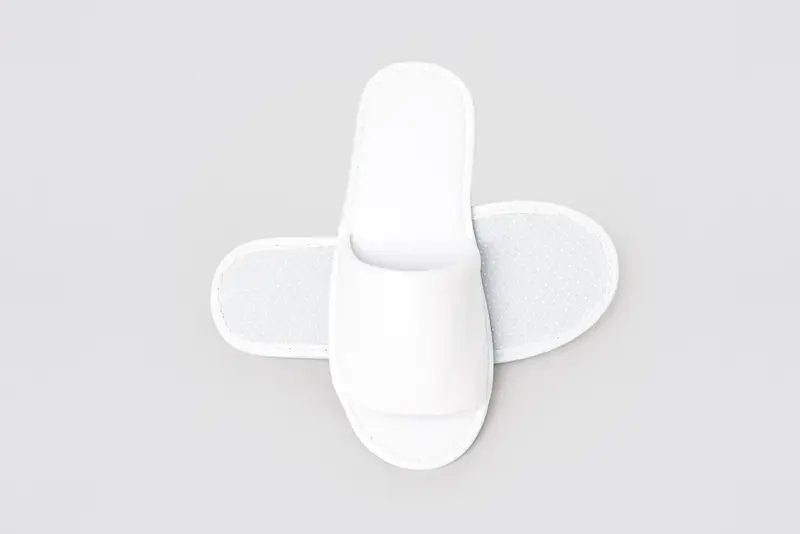 The P-Andy Velour Hotel Slippers combine comfort with an elegant design. In classic white and an open style, they are perfectly suited for hotels, guest rooms, and indoor areas. The soft and durable polyester ensures a pleasant wearing experience, while the dot cloth sole is designed for indoor use. An added benefit is the plastic-free packaging with a paper band, which avoids unnecessary plastic waste and provides a modern presentation.