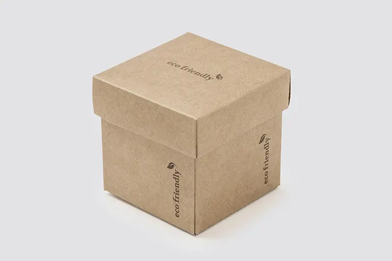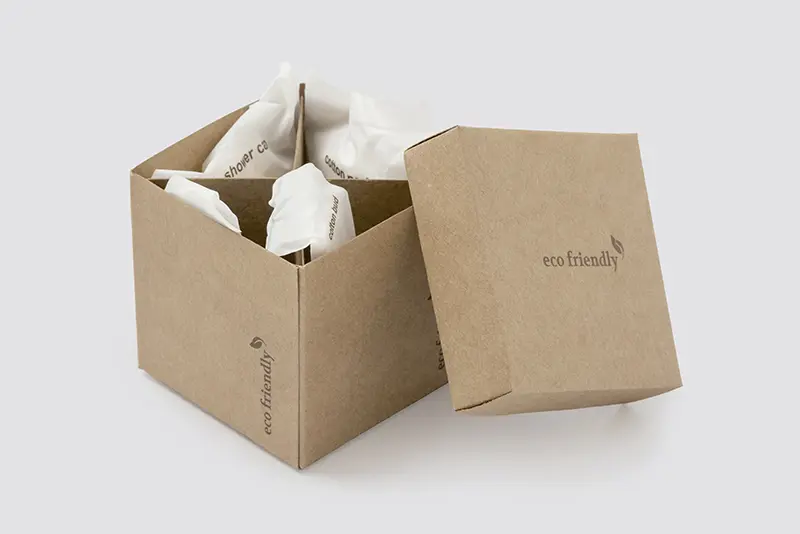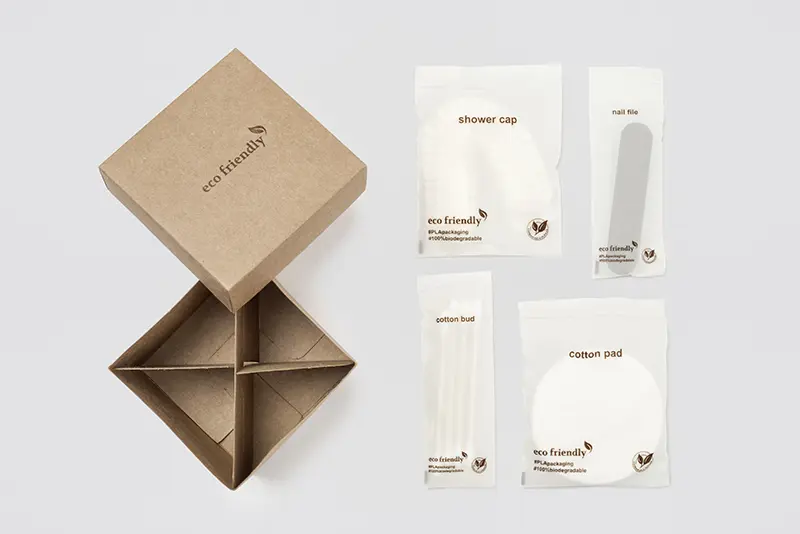 Amenities Box en carton recyclé, format 7x7x7cm, contenu : 4 disques en coton, 4 cotons-tiges avec un bâton de papier, 1 Lime à ongles avec surface de polissage 7cm, 1 Eco-Bonnet de douche PLA, 150 pcs./emballage intérieur