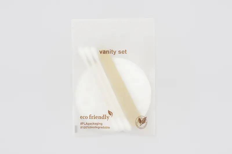 Vanity set 01, 3 disques en coton, 3 cotons-tiges avec un bâton de papier, 1 lime à ongles, emballé individuellement dans un sac PLA, avec impression "eco friendly", 100 pcs./emballage intérieur