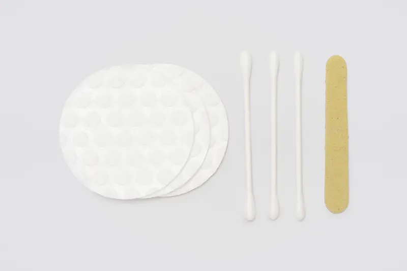Vanity set 01, 3 disques en coton, 3 cotons-tiges avec un bâton de papier, 1 lime à ongles, emballé individuellement dans un sac PLA, 100 pcs./emballage intérieur