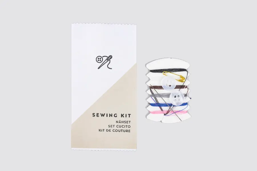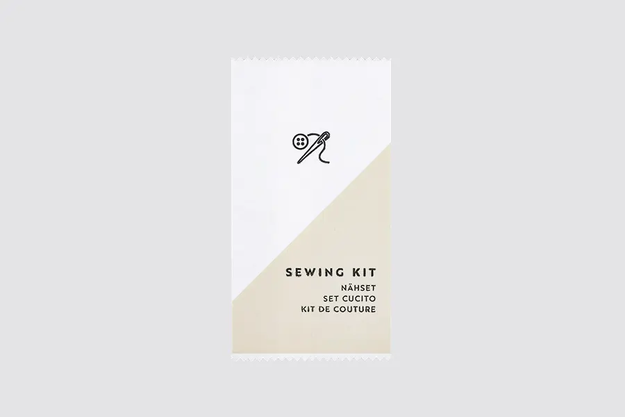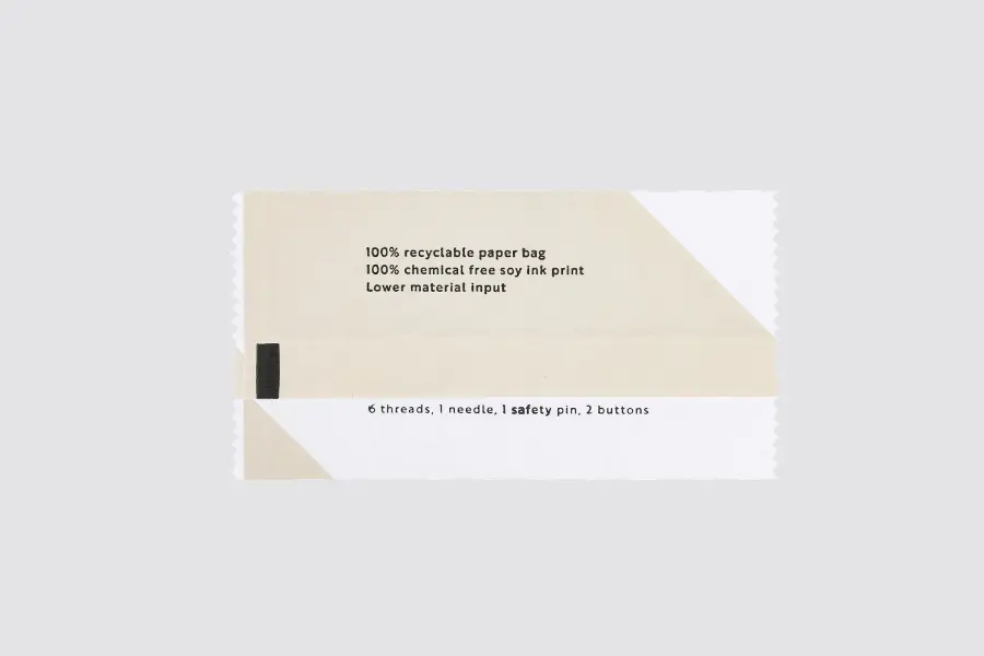 Set da cucito in bustina di carta, 6 fili, 2 bottoni, 1 spilla da balia,1 ago. Bustina di carta stampata con inchiostro di soia. La stampa di soia è naturale al 100% e priva di sostanze chimiche. 500 pz./confezione interna